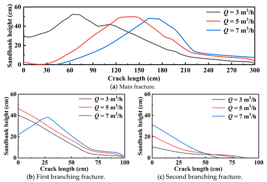 As illustrated in Figure 8b, a substantial disparity in the proppant placement morphology was evident within the first branched fracture compared to in the main fracture. When the proppant particle size was 212–380 μm (40–70 mesh) and the injection rate was 3 m3/h, the fracturing fluid carried the proppant particles into the first branched fracture at a lower speed. Subsequently, these particles were consistently deposited within the fracture, resulting in the formation of a sandbank characterized by an approximately triangular shape. The leading edge of the sandbank reached a height of 40.3 mm. When the injection rate was increased to 5 m3/h, the flow rate of the fracturing fluid in the first branched fracture increased, and more proppant particles were transported and accumulated inside the first branched fracture, with the sandbank leading edge height increasing to 46.5 cm. When the injection rate was 7 m3/h, the flow rate of the fracturing fluid in the first branched fracture increased rapidly. The proppant at the leading edge of the sandbank was continuously taken up and transported to the rear end of the sandbank, causing the sandbank leading edge height to decrease by 21.9 cm. Thus, within branched fractures, increasing the injection rate results in an initial increase, followed by a decrease, in the height of the sandbank’s leading edge.