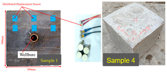 To understand the change in the rock mechanical properties caused by hydraulic fracturing, four shale samples with a size of 300 mm × 300 mm × 300 mm were used in a true triaxial hydraulic fracturing experiment. In the experiment, the distributed displacement sensors (DDSs) were applied to monitor the displacement change in the shale rock during hydraulic fracturing [30]. As indicated in Figure 1, the row spacing between two sensors was 100 mm, and the column spacing between two sensors was 70 mm. The rock mechanical properties and injection parameters of the experiments are shown in Table 1. In the experiments, the influence of the stress field, the injection rate, and the viscosity of the fracturing fluid on the fracture propagation were analyzed based on the true triaxial hydraulic fracturing test, combined with the distributed displacement sensors (DDSs) to monitor the displacement changes, and supplemented by CT to observe the changes in the rock micropore structure.