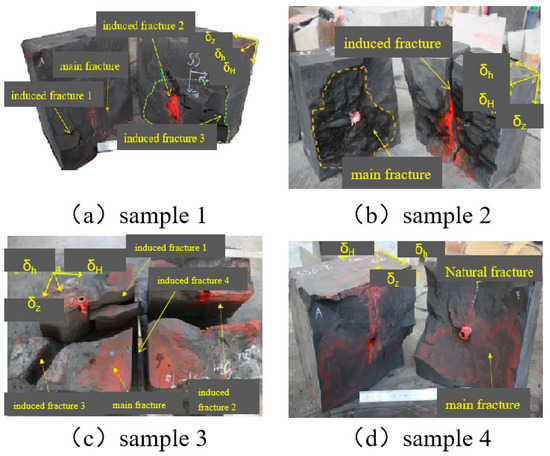 Figure 2a–d and Figure 3a–d show the fracture geometries of Sample 1–Sample 4. As indicated in Sample 1 (Figure 2a and Figure 3a), Sample 2 (Figure 2b and Figure 3b), Sample 3 (Figure 2c and Figure 3c), and Sample 4 (Figure 2d and Figure 3d), it can be found that main fractures were created in the center of the samples, while the number of induced fractures had significant changes. When the horizontal principal stress difference was 2.0 MPa, three induced fractures were created, while only one induced fracture was created when the horizontal principal stress difference increased to 4.0 MPa (Figure 2b and Figure 3b). A high pumping rate also contributed to the formation of induced fractures. When the pumping rate increased to 8.0 mL/min, it was found that four induced fractures were created compared to Sample 1. Meanwhile, increasing the viscosity of the fracturing fluid was averse to creating a branch fracture. When the viscosity of the fracturing fluid increased from 1.0 mPa·s to 25.0 mPa·s, only one main fracture was created.