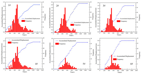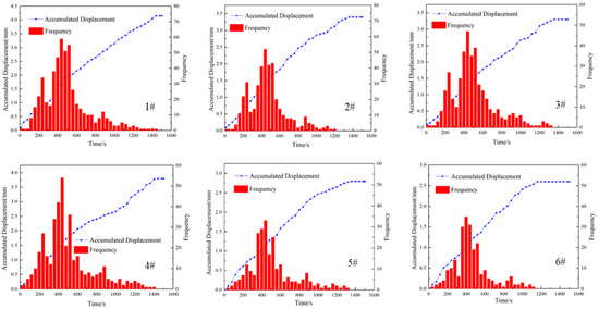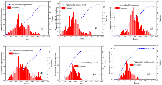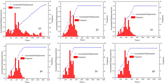 To further analyze the change in the displacement and signal frequency, the data obtained from the DDSs were analyzed. Figure 4 shows the changes in the accumulated displacement and signal frequency with the injection time. As indicated by DDS #1, the displacement of Sample 1 was 3.24 mm, the total signal frequency was 381, the peak frequency was obtained when the time was 520 s, and the peak frequency, which was obtained from DDS #1, was 55. The displacement of DDSs #2 and #3 decreased to 2.06 mm and 2.17 mm, and the total signal frequencies were 276 and 283, respectively. For DDSs #2 and #3, the peak frequencies were 47 and 49, which were obtained at 534 s. For DDS #4, the displacement and total frequency were 2.45 mm and 306, and the peak frequency was 53 when the time was 527 s. Due to the signal strength being further weakened, the displacements of DDSs #5 and #6 were 0.63 mm and 0.71 mm, respectively, the total frequencies were 68 and 71, and the peak frequencies were 11 and 14, which were obtained when the time was 538 s. From the experimental data, the displacement signals were distributed between 0 and 1240 s for DDS #1, and no signal was detected when the time exceeded 1240 s. For DDSs #2, #3, and #4, the displacement signals were distributed between 0 and 1160 s, while the displacement signals were only distributed between 0 and 960 s.