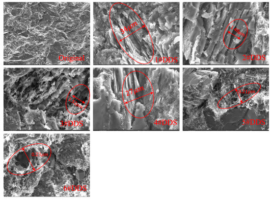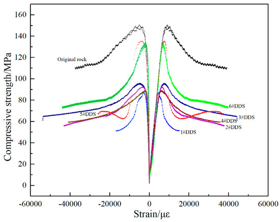 Figure 11 shows the rock mechanical test results of Sample 2. We took the original rock as the standard with a Young’s modulus and compressive strength of 37.64 GPa and 150.62 MPa, respectively. After the hydraulic fracturing, the Young’s modulus and compressive strength for DDS #1 decreased to 25.76 GPa and 94.21 MPa, decreases of 37.45% and 31.56%, respectively. For DDS #2 and #3, the compressive strength decreased to 113.51 MPa and 114.71 MPa, decreases of 24.64% and 23.84%, respectively, and the Young’s modulus reduced to 31.47 GPa and 31.78 GPa, respectively. For DDS #4, the Young’s modulus and compressive strength had dramatic decreases to 28.96 GPa and 102.27 MPa, decreases of 32.11% and 23.06%. DDSs #5 and #6 had slight decreases in the compressive strength to 142.65 MPa and 143.21 MPa, respectively, and in the Young’s modulus to 35.21 GPa and 35.18 GPa, respectively. Compared to Sample 1, the change degree of the rock mechanics’ properties was lower than that in Sample 1, and the change degree in the pore throat structure was also significantly weakened. The main reason for this was that, with the increase in the hydraulic fractures, the displacement in different locations had an obvious increase, which was the main reason for the deformation of the pore throat structure in the shale formation. The more severe the deformation was of the rock pore throat structure, the more severe the compression deformation and shear failure of the shale sample, and the more serious the degradation of the rock mechanics. Thus, the degradation of the rock mechanics in Sample 1 was higher than that in Sample 2.