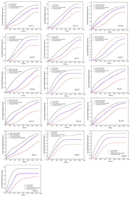 Based on the model, the displacement caused by hydraulic fracturing was calculated. Figure 16 shows the displacement located as DDSs #1, #2, #4, and #5 in Sample 1, Sample 2, Sample 3, and Sample 4 under three different situations; namely, only tensile failure or shear failure was considered, or the tensile failure and shear failure were considered together. Combined with Table 2, it can be seen that tensile failure was the main failure mode near the wellbore. As indicated in Table 2, it can be seen that the average percentage of tensile failure was much higher than that of shear failure. With the increase in the complex fracture network, the percentage of shear failure experienced a significant increase. Comparing Sample 1 and Sample 3, it was found that the average percentage of shear failure increased from 33.12% to 37.58% in Sample 1. In addition, the percentage of shear failure at DDS #5 was much higher than at the other three DDSs, which indicates that with the increase in the distance between the measurement point and the injection point, the likelihood of rock shear failure also increased significantly. Due to the porous medium of the reservoir rock, the enormous pressure generated during the injection of the fracturing fluid caused significant deformation of the fracture surface, leading to tensile failure of the rock. The displacement generated by the hydraulic surface may have also caused the rock pore-throat structure deformation in the far-field zone. As the distance between the measurement point and the injection point gradually increased, the influence of the normal stress on the crack wall gradually weakened, and the degree of shear stress reduction compared to normal stress was significantly reduced; hence, the proportion of shear failure gradually increased.