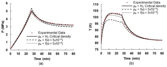 Given such deviations, we tested one or the other assumption in the simulation of an experimental process [], considering either the adsorbed phase density as a liquid, dependent on temperature and on α in the range 5 × 10−4 up to 5 × 10−3, or as a constant equal to the critical density. Figure 2 shows that pressure and temperature profiles do not significantly differ by varying the adsorbed phase density between the lower and upper limits. Note that reference [], in line with our observation, also pointed out the low sensitivity of the hydrogen adsorbed phase density parameter on simulation data derived from a 2-D model. A better fit was obtained assuming the critical state of the adsorbed phase density, so that this assumption was retained in the coming parts of the study.