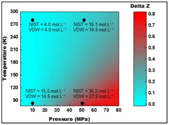Variation in the compressibility factor (z) between (VDW) and the NIST equations of state for hydrogen. The corresponding molar densities of compressed hydrogen were calculated with (VDW) and from the NIST REFPROP database for different (P, T) conditions denoted by
