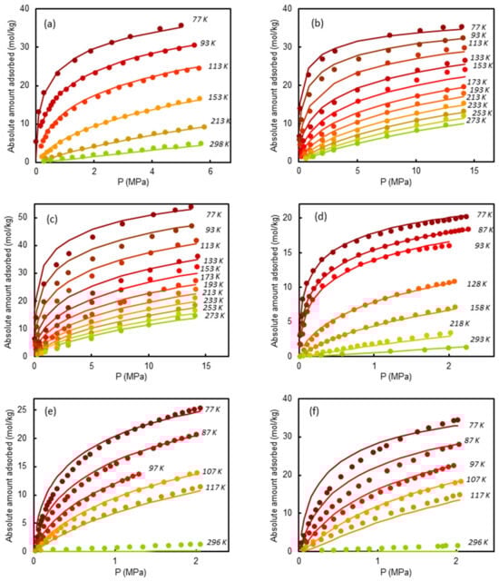 rev-D-A model fit (solid lines) to experimental absolute adsorption isotherms of hydrogen on activated carbon and MOF: (a) AX-21 []; (b) MSC30 []; (c) MSP20X []; (d) Cu-BTC []; (e) MOF-5 []; (f) MOF-177 [].