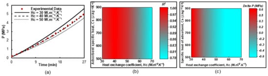where mads (kg) and mw (kg) are, respectively, the mass of the adsorbent and of the tank, and their corresponding specific heat capacities are Cs (J·kg−1K−1) and Cw (J·kg−1·K−1), ma (kg) and mg (kg) are, respectively the mass of hydrogen in the adsorbed and gas phases, their specific heats are Cv,a (J·kg−1·K−1) and Cv,g (J·kg−1·K−1), obtained with the reference fluid thermodynamic and transport properties database (REFPROP) software version 10.0 []. For the calculation of Cv,g the conditions of pressure and temperature of the system were applied. Cv,a, was computed at the same temperature accounting for the adsorbed phase density (ρcr).