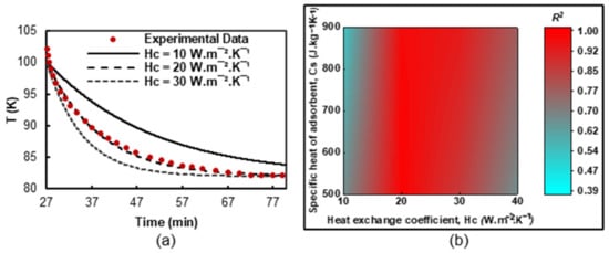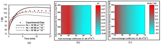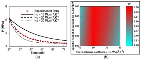 S (m2) is the wall surface area of the tank, Ta (K) is the temperature of the surroundings and T (K) is the temperature of the system. (J·s−1) is the rate of adsorption heat, which represents the flux of heat released when adsorption takes place or the flux of heat adsorbed when desorption occurs. To determine the isosteric heat of adsorption, Qa (J·mol−1), the Clausius–Clapeyron equation (Equation (43)) is applied to the isotherm model (Equation (22)).