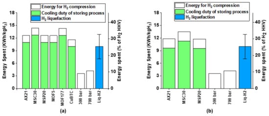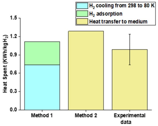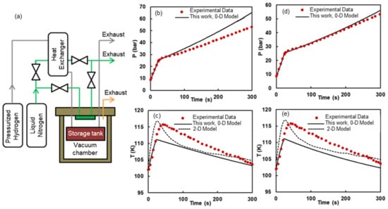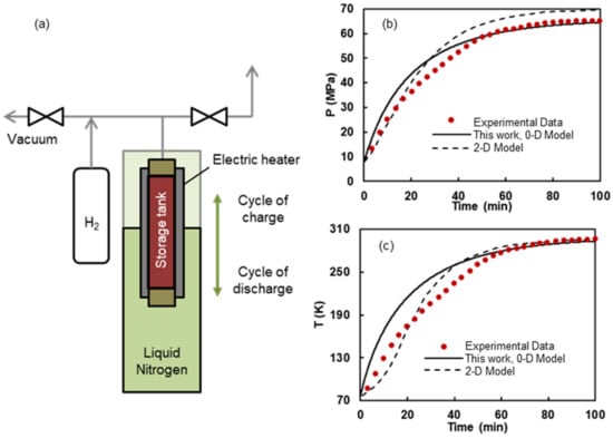 Experimental validation of these models has been evaluated both at ambient temperature [,,] and at cryogenic temperature [,,]. Experimental tests at cryogenic temperature, which is the process that most concerns us, generally use a tank filled with the adsorbent material, submerged in a liquid nitrogen Dewar. Under these conditions, charging and discharging processes are operated, including steps of cooling, compression, storage, heating, pressure release, and dormancy of the system. Regardless of the use of sophisticated 1-D or 2-D models implemented in Multiphysics software, the simplified approach of the 0-D models can efficiently be employed to simulate reservoirs operating adsorbent masses at g–kg scales [,,]. In most works, simulation models aim to reproduce temperature and pressure profiles in the system in order to determine optimal operating conditions and to upscale the process. Parameter sensitivity studies are also performed in order to evaluate experimental data that are difficult to directly measure, such as heat transfer coefficients and specific heat of the adsorbed phase. Moreover, as introduced earlier, the process simulation can enable accurate assessment of the energy efficiency of the adsorbed hydrogen storage system, which, to the best of our knowledge, has only been carried out in a limited number of works [].