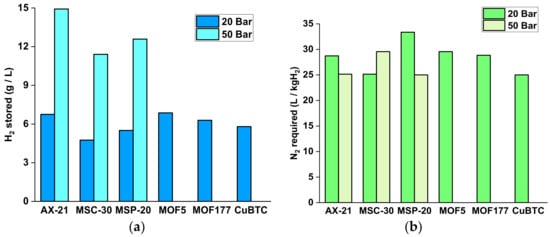 Consequently, in order to enhance volumetric and gravimetric adsorption capacities of hydrogen in porous materials, operation at cryogenic temperature (77 K or above) is commonly adopted. At the temperature of liquid nitrogen (77 K) and at a pressure of 100 bar, the same MOF material offers volumetric and gravimetric adsorption capacities of 44.9 gH2·L−1 and 13.0 wt%, respectively. Although carbonaceous porous materials such as activated carbons exhibit lower gravimetric adsorption capacities, reaching at best 7–10.4 wt% at 60 bar and 77 K [], they are competitive with MOFs because they can demonstrate larger volumetric storage capacities thanks to their higher bulk density, so that a larger mass of adsorbent can be packed in the vessel. Moreover, the activated carbons are inexpensive in comparison to MOFs and commonly available on the market []. Furthermore, several adsorbent materials have been engineered at the simulation scale, like a titanium decorated carbon [], exhibiting gravimetric hydrogen storage capacities up to 6.67 wt% under ambient conditions.