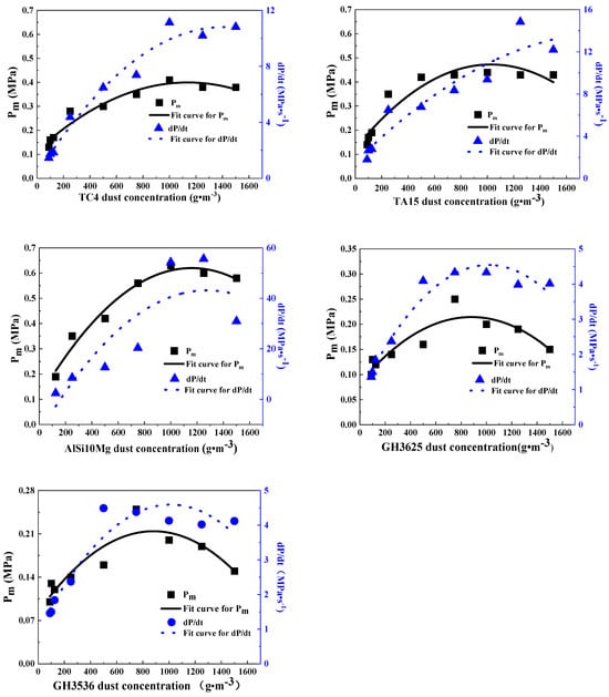 The comparative results revealed that the Pmax and Kst of the AM dusts first increased and then decreased as the dust concentration increased, as shown in Figure 6. This occurred because the number of metal powder particles that participated in the reaction in the 20 L sphere increased with the rising dust mass concentration, and a sufficient and rapid explosive reaction of metal powders occurred when sufficient oxygen was present in the vessel, resulting in an increase in Pmax and dp/dtmax. When the dust mass concentration increased to a specific value, the dust clouds of the metal powder formed in the vessel reacted sufficiently with oxygen, and the maximum explosive pressure was recorded. When the dust mass concentration continued to increase, the oxygen content in the 20 L sphere was not sufficient to allow all powder particles to participate in the reaction, and energy was consumed during the flame heat transfer among powder particles; thereby, reducing the explosive pressure. The optimal reaction concentration, which was similar to the stoichiometric coefficient in the reaction, was observed in every AM dust sample during the explosion. At this time, the optimal mixing ratio of combustible dust and oxygen was almost attained, no oxygen-deficient and fuel-lean flammable atmosphere was present, and the explosive reaction resulted in the complete release of fuel energy (calorific value) []. Therefore, the subsequent experiments were carried out under the upper limit of explosion.