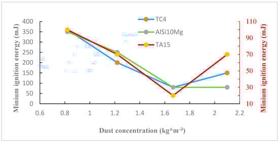 As the dust concentration increased, the MIE values of the three types of combustible alloy powder decreased gradually; subsequently, those values increased gradually after the dust concentration increased to a specific value. At the declining stage, the number of dust particles ignited by the electric spark per unit volume increased with the dust concentration, resulting in an increase in the released heat and reaction rate. Consequently, the MIE of the dust cloud decreased as the dust concentration increased. Because the oxygen concentration was constant in the confined space, an increase in the dust concentration would result in an insufficient oxygen concentration, and the electric spark energy could not ignite all the peripheral dusts, resulting in an incomplete combustion and an ascending curve. Figure 7 shows the MIE ranges of the three types of alloy powder. Specifically, the MIE curve of powder TC4 first decreased and then increased, and the MIE values were within 80–360 mJ. The variation trends of the MIE values of powders TA15 and TC4 remained consistent, and the MIE values were within 20–100 mJ. The MIE of the AlSi10Mg powder first decreased and then remained unchanged, and the MIE values were within 80–350 mJ.