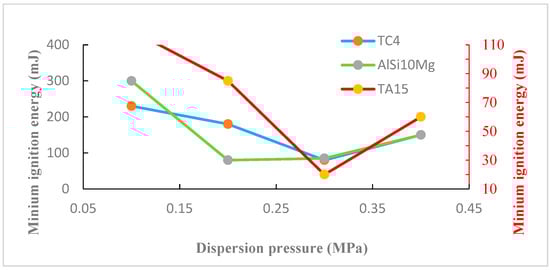 Effect of spraying pressure on MIE of TC4, TA15, and AlSi10Mg dust.