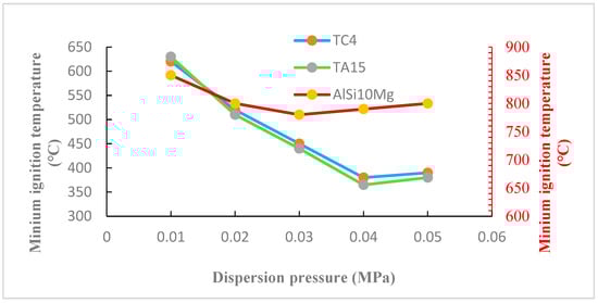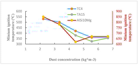Figure 9 shows the general variation trend of the MITC of the TC4, TA15, and AlSi10Mg powders based on the mass concentration when the dust spray pressure was constant (i.e., 0.04 MPa). Specifically, the MITC values of the TC4, TA15, and AlSi10Mg powders decreased as the dust cloud concentration increased, before their respective optimal mass concentrations were attained. This occurred because the increase in the dust mass concentration reduced the particle spacing and the reaction path for heat transfer; thereby, resulting in an expedited release and transfer of combustion heat. Because the oxygen concentration remained constant in the space, the increased dust concentration resulted in an incomplete combustion of dust particles and the incomplete combination of the specific surface area containing dust with oxygen when the optimal mass concentration was attained. Additionally, excessive dusts were agglomerated, resulting in a reduced specific surface area of dust and a higher ignition temperature of the dust cloud.