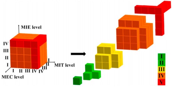 The dust-explosive sensitivity of AM was classified via a three-dimensional risk matrix, as depicted in Figure 11. The detailed element division is provided in Table 11. Therefore, the AM dust-explosive sensitivity was divided into five levels.