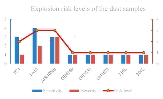 Based on the established AM dust explosive risk assessment model, we concluded that the explosive risk levels of the four categories and eight types of AM dust samples were Grades II, III, III, I, I, I, I, and I. See Figure 12 for details regarding the determination of explosive risk levels of the AM dust samples.