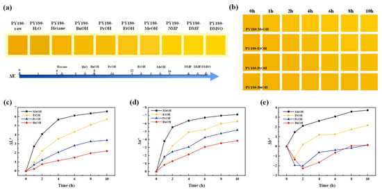 Color block of (a) PY180-solvent and (b) PY180 treated with four alcohol solvents at different times. L*a*b* color analysis of PY180: (c) ΔL* (lightness), (d) Δa*, (e) Δb* vs. treatment time.