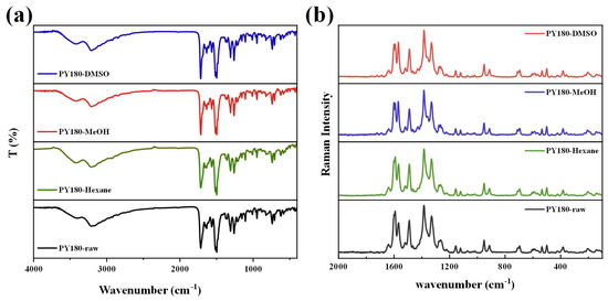 The FTIR (a) and Raman spectra (b) for PY180-raw, PY180-Hexane, PY180-MeOH, and PY180-DMSO.