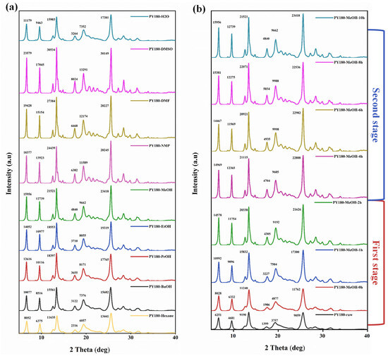 Experimentally observed PXRD patterns of (a) PY180 pigmented in the different solvents with the pigmentation time of 10 h, (b) PY180 in MeOH sample collected at different times.