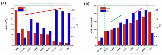 (a) Difference in solubility parameter (Δδ in red), (b) molecule polarity index (MPI in red) versus ΔE (blue). Green dashed lines for polar hydrogen solvent, magenta dashed line for aprotic polar media. The arrows indicate the overall trend of ΔE.