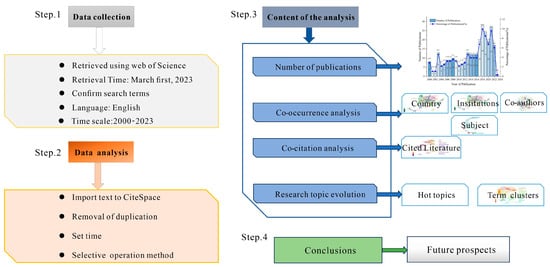 The emerging and innovative method for bibliometric investigations contains a visualization of scientific contributions based on social network analyses and colored graph theory. Among numerous tools/methods established for scientometric analyses, Java-based software (CiteSpace) was used to visualize and map the scientific knowledge domain. It is freely available software and was initially established at Drexel University in the United States by Dr. Chen Chaomei [32]. Given the large number of publications we identified, it would be difficult to manually extract their information, so it was necessary to use the software. At the same time, CiteSpace has visualization capabilities that can help us solve these problems [33]. Therefore, we chose the CiteSpace software (version 6.1.R6.64-bit) as the main tool, thus providing a comprehensive analysis of the selected literature.