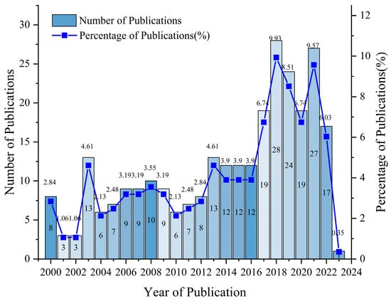 Number of publications in the field of agricultural drainage water treatment per year from 2000 to 2023. The data for 2023 are until 1 March 2023.
