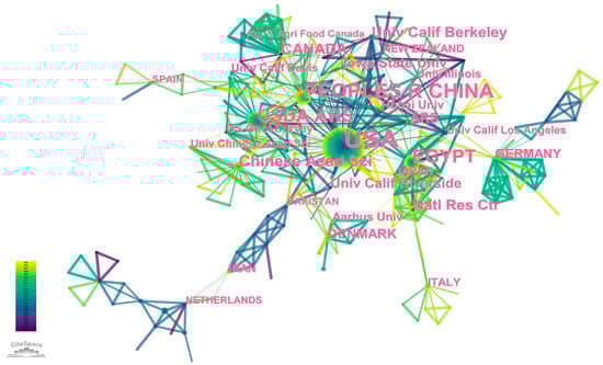 From the perspective of cooperative networks, intermediary centrality is important. Mediation centrality refers to the strength of the number of connections a node has with other nodes in the network; high Mediation centrality represents that the node has a strong influence within the network and is a critical node in the network relationships [33]. The United States has the highest degree of centrality (Degree of centrality [Centr] = 0.55), followed by China (Centr = 0.53). There is also a certain amount of cooperation between the two countries. Furthermore, these two countries have also established cooperative relationships with other countries, such as Egypt and Canada.