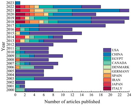 Top ten countries in the area of agricultural drainage water treatment in terms of the specific stack of publications in each year from 2000 to 2023. The data for 2023 are through 1 March 2023.