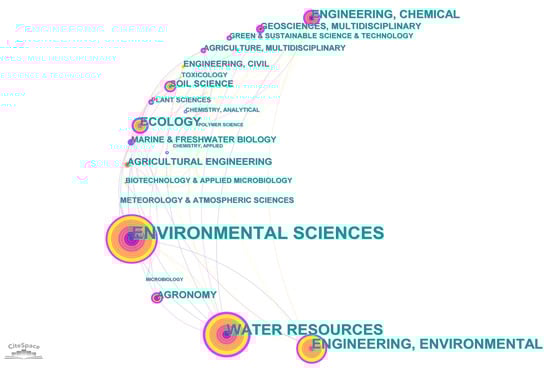 Through co-occurrence analysis of the subjects in the publications, we constructed a subject network for agricultural drainage water research, showcasing the evolution of mainstream and interdisciplinary disciplines in this field (Figure 6, Table 4). In general, the study of treating agricultural drainage water has evolved from being primarily focused on environmental sciences and water resources to encompassing a range of disciplines. In 2000, agricultural drainage water research appeared in environmental science (Count = 177, Centr = 0.39) and water resources (Count = 82, Centr = 0.35). At this time, it is well known that frequent human agricultural activities and the widespread use of pesticides have led to substantial agricultural water pollution and environmental pollution. In addition, with the maturity of modern environmental ecology theories and methods, the use of environmental ecology concepts and methods to solve the environmental problems caused by this situation have become the focus of scholars.