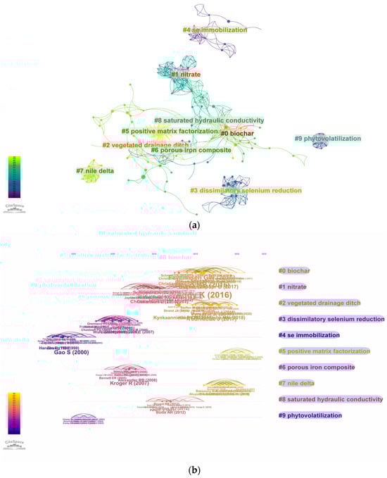 Clustering of frequently co-cited literature in the field of agricultural drainage water treatment. ((a) Clustering diagram of co-citations; (b) Timeline diagram of co-citation clusters, produced by CiteSpace).