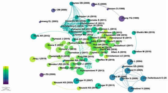 We analyzed the number of papers and collaborative networks among authors and discovered that 524 authors are actively engaged in researching agricultural drainage water (Figure 5). Among these authors, twenty-seven authors have published three or more articles. A more detailed list of the top 20 active authors of articles related to agricultural drainage water treatment is displayed in Table 3. Among these highly productive researchers, Norman Terry from the University of California, Berkeley, was one of the earliest to focus on this field. Z.H. Ye from the School of Life Sciences at Sun Yat-sen University in China was one of the earliest Chinese scholars to study this area. In addition, three Chinese Academy of Sciences authors have published two or more papers. The network of authors resembles a sky filled with stars, appearing more scattered.