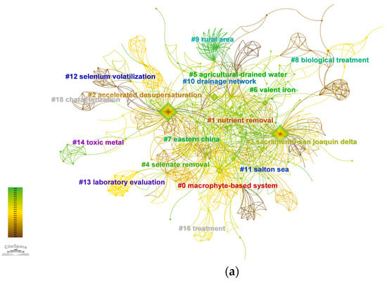 The “selenium fixation” cluster began in 1997. This is due to the fact that selenium may be present in agricultural drainage, and selenium fixation through chemical and biological reduction processes can remove selenium from agricultural drainage water and address possible agricultural water pollution during the process [37]. Current research has shown that plant uptake of selenium may be an effective means of removing selenium from drainage sediments [38]. The cluster “dissimilatory selenium reduction” started in 2003 and lasted until 2008, ranking fourth among the clusters we analyzed. In addition, selenate was also a common pollutant in selenium-containing agricultural drainage, which could be converted into elemental selenium nanoparticles under the action of microorganisms [39]. To some extent, it further reflects the current attention paid to selenium in the field of agricultural drainage water treatment.