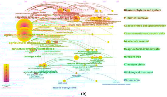 Clusters of agricultural drainage water treatment research based on the terms. ((a) clustering diagram for term analysis; (b) timeline diagram for term clustering.).