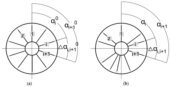 Fans need to be designed to meet dynamic balancing requirements while minimizing the loss of aerodynamic performance. Therefore, both the dynamic balance nonlinear equation and the linear inequality for the minimum pitch between blades must be satisfied. Figure 1 shows a schematic diagram of the circumferential distribution of the blades of a centrifugal fan with the number of z blades. The circumferential angle of the ith blade needs to satisfy the following relationship: