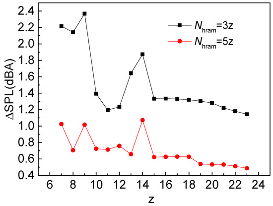 The aerodynamic noise emanating from the traction motor fan primarily falls within the three-times-BPF range. For instance, in the case of a fan with 17 blades and a rotational speed of 4000 revolutions per minute (r/min), the third harmonic ( = 3 z) corresponds to a frequency of 3400 Hz. This implies that the predominant noise source is concentrated within 3400 Hz. To ascertain the impact of on the computational outcomes, a series of 34 computations were conducted. These computations employed as the objective function, varying the number of blades from 7 to 23 and considering values of 3 z and 5 z, respectively. The findings are depicted in Figure 2, revealing a consistent trend in noise reduction regardless of whether is set to 3 z or 5 z. Given that ∆SPL primarily serves to gauge the effectiveness of noise reduction, a qualitative analysis of the noise reduction impact can be performed irrespective of the specific value chosen for . Consequently, in the interest of computational economy, the latter is set to be equivalent to 3 z.