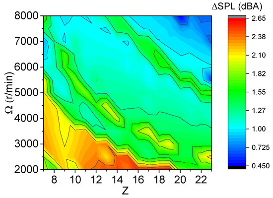 The fundamental frequency of aerodynamic noise generated by a traction motor fan is contingent upon fan speed, while the BPF is determined by both the fundamental frequency and the number of blades. Consequently, the distribution of acoustic energy in the spectrum is intricately linked to both the speed (Ω) and the number of blades (z). The fan’s frequency is a function of the fundamental frequency and blade count. In Figure 3, with 17 blades, the testwas sampled at 500 r/min intervals across a rotational speed range of 2000–8000 r/min. Subsequently, optimization of was performed, yielding the extent of noise reduction at various rotational speeds. Herein, ΔSPL denotes the disparity in the total A-weighted sound level post-optimization between evenly and unevenly spaced blades. The magnitude of this difference quantifies the noise reduction effect achieved through the implementation of unevenly spaced blades. The figure illustrates that the noise reduction effect of unevenly spaced blades varies under different operational conditions and speeds. In the low-speed range, optimized unevenly spaced vanes yield a reduction of up to approximately 2.5 dBA compared to evenly spaced vanes. Conversely, the noise reduction effect is less pronounced in the high-speed range. Notably, as depicted in Figure 4, the relationship between noise reduction and blade count is non-monotonic, showcasing instances where certain blades lead to more substantial noise reduction. Figure 5 provides a graphical representation of the ΔSPL distribution across blade counts ranging from 7 to 23, within the speed range of 2000–8000 r/min. Evidently, the noise reduction effect is more pronounced in the low-speed range. Additionally, as rotational speed escalates, enhanced noise reduction is observed at specific blade counts. Consequently, with regards to aerodynamic noise control for traction motors, the optimal blade count can be tailored to align with the motor’s rated speed, maximum speed, and specific noise reduction requirements.