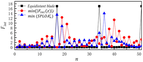 The computational results of the isometric scheme and the two objective function-seeking optimization schemes are given in Figure 6. The values at BPF and BPF multiples are reduced for both Scheme 2 and Scheme 3, while new peaks appear at other frequency locations. It shows that the acoustic energy at this frequency is reduced and the acoustic energy at other frequencies is increased, and the unequal spacing scheme reduces the peak value of the fan’s tonal noise.