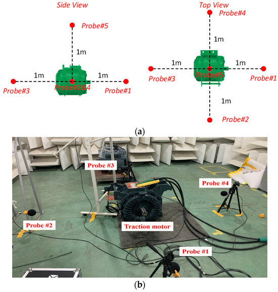 Motor noise test. (a) Schematic layout of measurement points. (b) Test setup.