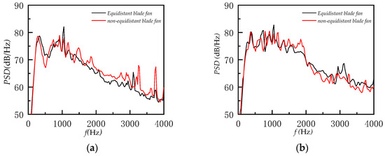 Scheme 2 uses an unequally spaced blade optimization design to minimize the objective function , i.e., to minimize the tonal noise at the fan BPF. As can be seen from Figure 5, the value of at the BPF is 0, but the value of at the nearby frequencies increases, which indicates that the unequally spaced fan disperses the energy at the BPF and its harmonics to the nearby frequencies, and its total A sound level decreases compared with that of the equidistant blades.