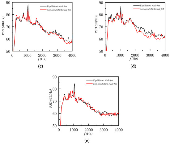Unequally spaced blades have different leaf spacings and different phase differences between the two neighboring blades, and this harmonic coherence manifests itself in the power spectrum by attenuating the peaks of the equidistant fan at the fundamental frequency to a distribution of smaller values. From Figure 8a, it can be seen that the power spectral densities of both equally spaced blade fan and unequally spaced blade fan motors have significantly higher SPL amplitudes at the BPF than at the other peak points, with similar distribution patterns at the other measurement points, as shown in Figure 8b–e. This indicates that the tonal noise at the BPF accounts for the majority of the aerodynamic noise of the traction motor. The unequally spaced blade scheme, on the other hand, has a significant reduction in the peak sound pressure level at the BPF, and its five-measurement-point average of the sound pressure level amplitude at the BPF is reduced by 4.6 dBA, which is a very obvious noise reduction effect. However, there is a peak in the band near the BPF, suggesting that the unequally spaced blades attenuate the tonal noise at the BPF frequency, distributing the energy more evenly across the frequency range. Figure 9 shows the one-third-octave range of the motor noise for an equally spaced blade fan and an unequally spaced blade fan. Compared to the equally spaced blade fan, the peak sound pressure level of the unequally spaced blade fan in the 1000 to 1200 Hz octave band decreases significantly, allowing the sound energy to be distributed to the nearby frequency bands, reducing the tonal noise, and obtaining a more homogeneous spectral energy distribution. It can also be seen from the figure that the unequally spaced blades selectively distribute energy into the frequency band range where the human ear is not sensitive, thus reducing the A-weighted overall sound pressure level of the traction motor. Based on the calculations of the algorithm above, Scheme 2 reduces the value at the BPF by 13 and the A-weighted overall sound pressure level by 0.7 dBA compared to the equidistant blade scheme, and the sound pressure level magnitude and the A-weighted overall sound pressure level at the BPF in the experimental results are reduced by 4.6 dBA and 1.2 dBA, respectively. The feasibility of the method to reduce the BPF tonal noise and the A-weighted total sound pressure level of the traction motor is shown. This study may provide a valuable reference for engineering practice in related fields.