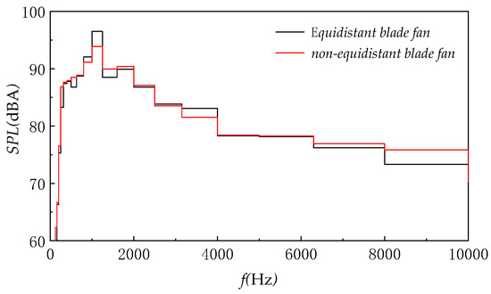 According to the above equation, it can be seen that the noise generated by the equally spaced blade fan is mainly distributed at the fundamental frequency and its octave, which results in the presence of high tonal noise at that location. In contrast, the values of the unequally spaced blade fan are non-zero at most octave frequencies, indicating that the acoustic energy is more dispersed, and thus the interference function actually modulates the noise spectrum.