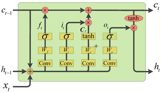 After the global and local statistical features of the fault snapshot dataset are extracted, it is also very important to recognize the fault patterns of the transmission line. Although long short-term memory (LSTM) [11,12] has been widely applied to recognize the fault type in the fault diagnosis field, conventional LSTM only focuses on the data’s temporal dependency information and ignores the spatial structure information. As an improved version of the LSTM, the convolutional LSTM (CLSTM) owns the superiority to keep the data’s temporal dependencies, such as the LSTM, and consider the data’s spatial correlation, such as the CNN, which has been widely applied to perform the classification tasks recently [13]. Because of the CLSTMs above merits in identifying the fault pattern, in this paper, we adopt the CLSTM-based approach to recognize the reinforced data features mined by the suggested SCFP model.