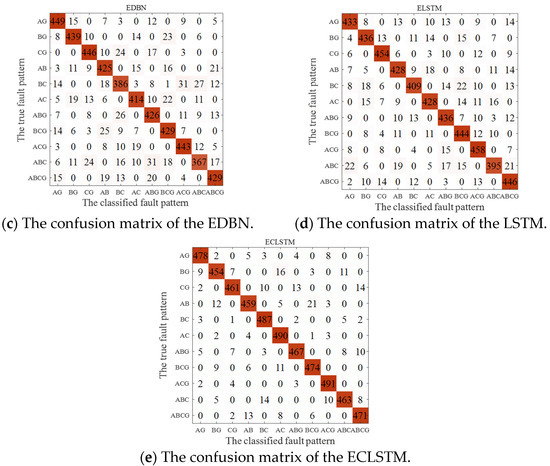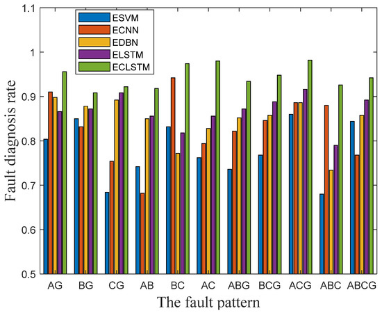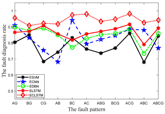 (4) To fully verify the performance of the proposed ECLSTM-based transmission line diagnosis scheme, the ECLSTM model is compared with some closely related diagnosis models in terms of diagnosing the fault. The experiments of the suggested ECLSTM and the comparisons with related approaches are carried out on the datasets of the simulated power system. In comparison with the related methods, the fault diagnosis results display the superior effectiveness of the ECLSTM-based recognition scheme.
