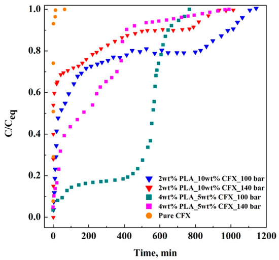 The mass transport mechanisms involved include water penetration into the systems, polymer chain cleavage, drug dissolution, and polymer erosion. The water imbibition leads to polymer swelling that represents the reason why an initial faster release rate is observed. Then, after a certain time of water uptake, the cleaving of the ester bonds occurs, leading to a reduction of polymer molecular weight and, during this phase, a constant drug release is obtained (from 100 up to 400 min of violet and green lines reported in Figure 8). Upon the cleaving, the newly created -COOH groups and the increased osmotic pressure make the PLA chain more hydrophilic, allowing substantial amounts of water to enter the system. In this way, a faster drug release is recorded again (see the last minutes of violet and green lines reported in Figure 8). It is possible to claim that the former PLA degradation mechanism is critical for the controlled drug release, i.e., the cleavage of PLA ester bonds generally affects the rate of polymer matrix swelling and the subsequent drug diffusion. However, this mechanism does not reflect the drug behaviour release of 2%w/w PLA particles (red and blue lines reported in Figure 8): in this case, CFX was not efficiently entrapped into the polymeric matrix after SC-CO2-assisted electrospray; therefore, CFX was distributed on the external surface of polymeric particles, and it was completely released in the external medium before PLA degradation took place.