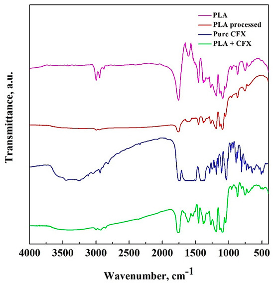 FT-IR spectra of before and after processing PLA and 4 wt% CFX-loaded PLA particles are reported in Figure 10.