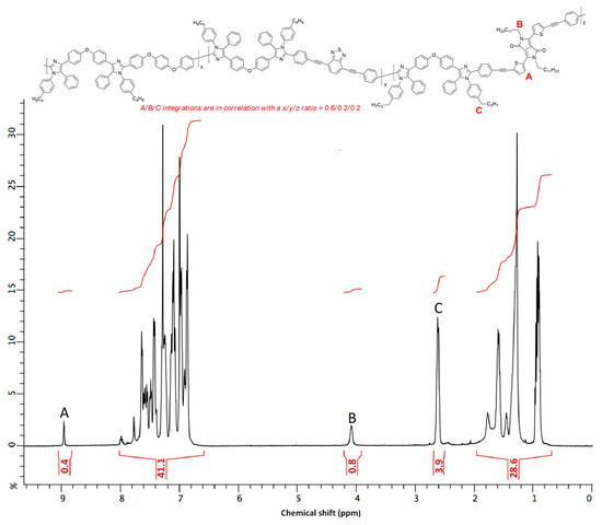 These poly(tetraaryl imidazoles) (PTAI) copolymers were synthesized using the Debus–Radziszewski reaction under microwave irradiation. This technique is useful to quickly and easily access some new macromolecular structures [58,59]. The chemical structure of newcomer’s polymers P2 and P3 were checked using 1H and 13C NMR (see SI for all spectra). The following Figure 1 presents as example of the 1H NMR spectrum of polymer P3. This polymer was completely soluble in chloroform, providing a solution with low viscosity. The incorporation of the DKPP monomer into the polymer backbone was evidenced by the presence of characteristic peaks: C-H (A) from the thiophene rings and N-CH2 (B) from the alkyl chains. In addition, the Ar-CH2 (C) signal attributed to the butylaniline chemical group (belonging to the aryl imidazole units) shows a good correlation with the expected ratios for M1-, M2- and M3-based repeating units (i.e., 0.6/0.2/0.2), respectively, corresponding to all the components initially engaged in the polymerization.