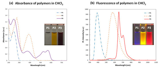 Absorption (a) and emission (b) spectra of the polymers in CHCl3 solution.
