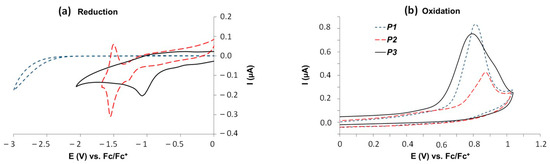Regarding the negative potentials, reduction waves were observed for only two derivatives. For P1, the optical band gap value (given in Table 2 and determined using the UV–visible absorption onset [64]) leads us to think that the reduction peak should take place after −2.5 V. Due to the solvent front (beginning at ~−2.2 V for propylene carbonate), it seems obvious that this polymer reduction cannot be observed using CV. The obtained curve is, however, shown in Figure 5 (intensity values in ordinate were divided by ten in order to be presented on the same graph as P2 and P3 voltammograms), and nothing was detectable except the solvent breakdown. Consequently, the optical band gap was used to estimate the P1 polymer’s LUMO value. Respectively, for P2 and P3, a quasi-reversible reduction peak at −1.35 V and an irreversible peak at −0.82 V vs. Fc/Fc+ were observed, demonstrating both electrochemical band gaps in accordance with optical ones. The three resulting LUMO levels (Table 3) are mainly controlled by the LUMO level of the polymers acceptor moieties and thus driven by the increasing electron-withdrawing strength of the following units: diphenyl ether < benzothiadiazole < diketopyrrolopyrrole.