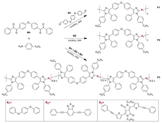 Bis(aryl α-diketone) (M4) is the precursor for the main aryl imidazole repeating unit of all synthesized polymers. It was prepared as described in a previous work [41]. The resulting aryl imidazole unit will be coupled with three different units (M1), (M2) and (M3), which are bis(aryl dialdehyde), benzothiadiazole (BTD) and diketopyrrolopyrrole (DKPP) derivatives, respectively. (M1) was prepared as described in the previous work [41] and the procedure for (M2) and (M3) syntheses is further described in this paper.