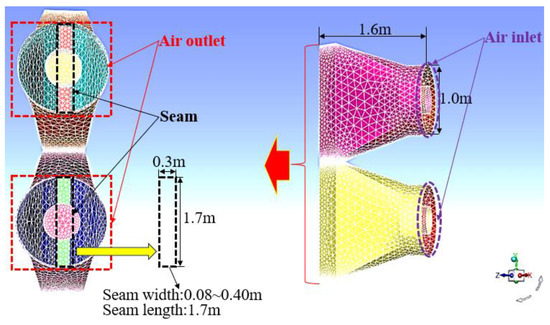 China’s metal mines mostly use shafts and ramps for joint development [15]. Under the combined action of multiple factors such as long-term ground pressure and frequent driving, dampers are seriously damaged, and their management and maintenance are extremely inconvenient, so it is necessary to set up an air curtain to regulate the air flow [16]. In this paper, the simulation parameters of the studied roadway are set to 4.2 m wide, 3.5 m high, and a 14.7 m2 cross-sectional area.