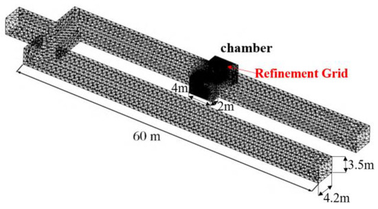 Using the pre-processing software GAMIDT Gambit 2.4 for modeling, a 3D physical model of the roadway with a length of 60.0 m, a width of 4.2 m, and a height of 3.5 m was established under the Cartesian coordinate system. Among them, the chamber is located in the middle of the roadway, respectively placed on both sides of the roadway, each side of the chamber is 4.0 m long, 2.0 m wide, and 3.5 m high. The air curtain fan is placed in the chamber on both sides of the roadway, the air outlet and the roadway wind flow are arranged at an angle of α, and the jet angle α is 5~60°, as shown in Figure 1. The diameter of the single fan is 1.0 m and the height is 1.7 m; the overall length of the air curtain is 1.6 m; the width of the bar gap is 0.3 m and the length is 1.7 m; the width of the air outlet is 0.08~0.40 m; and the longitudinal arrangement of the double fan is shown in Figure 2. Figure 3 is meshing of the air curtain model.